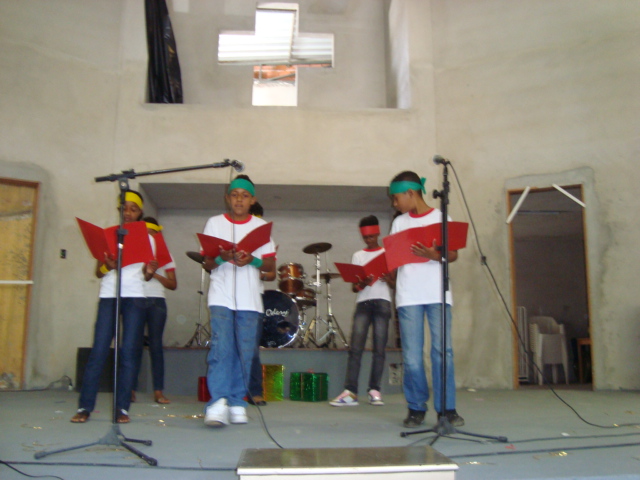 As crianças e os adolescentes apresentaram, com entusiasmo, números musicais, dança e um jogral para homenagear e adorar o Senhor Jesus por tão grande salvação –